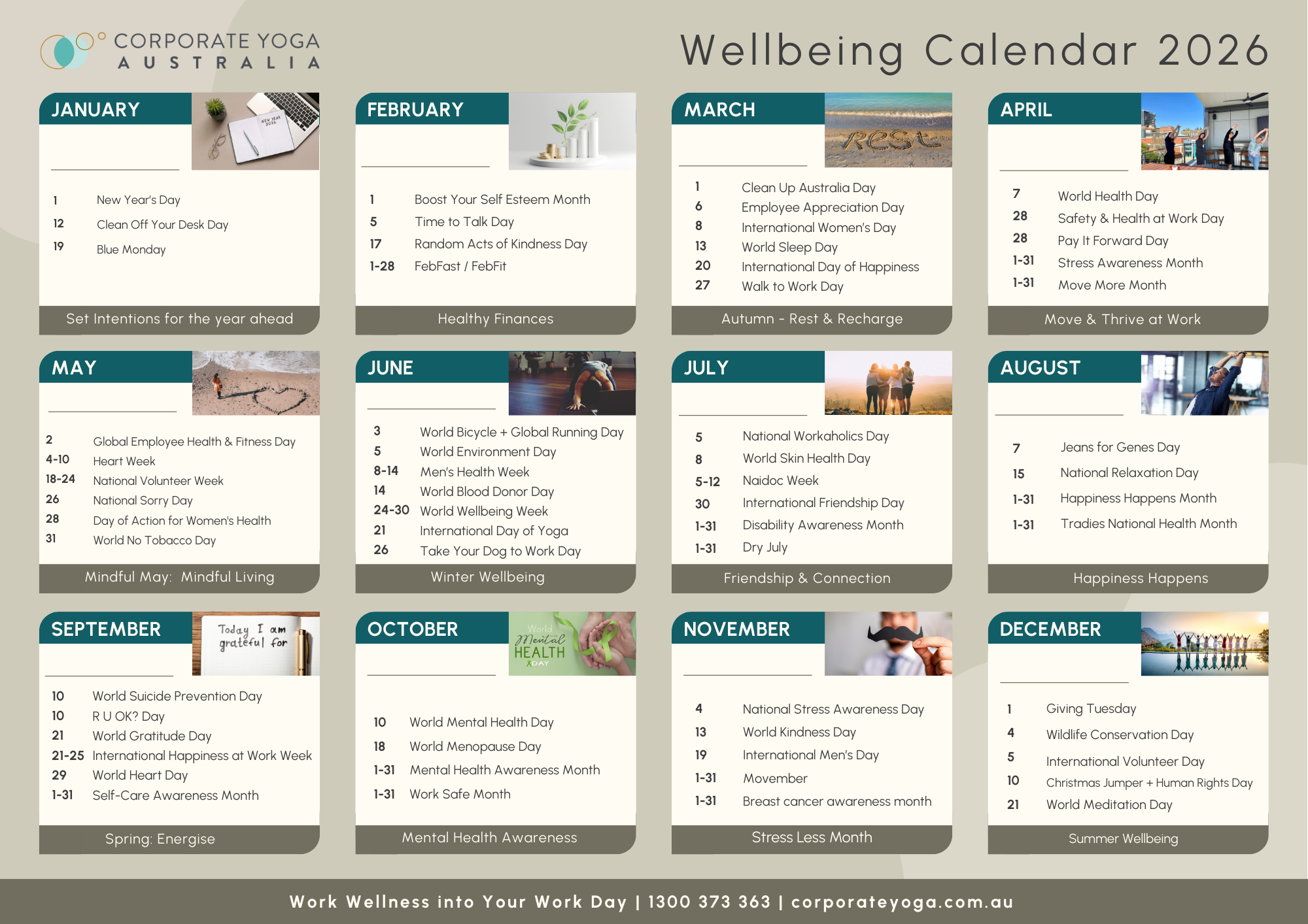 Download our FREE 2026 Wellbeing Calendar, a handy guide to help you plan engaging Wellbeing events around key wellbeing days and themes throughout the year.